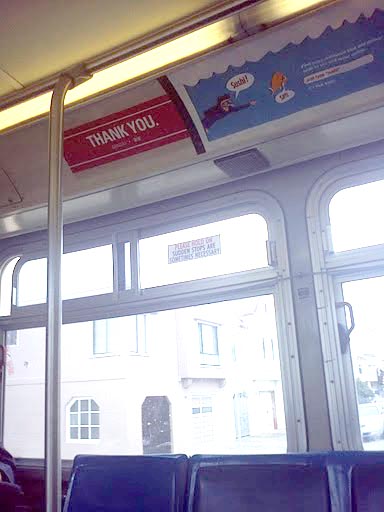 Last week I was riding the good ol’ MUNI here in San Francisco and noticed something interesting: a sticker on the bus from MUNI saying “Thank You” where the advertisements usually are. I snapped a picture of it and sent into one of my favorite blogs, Muni Diaries.